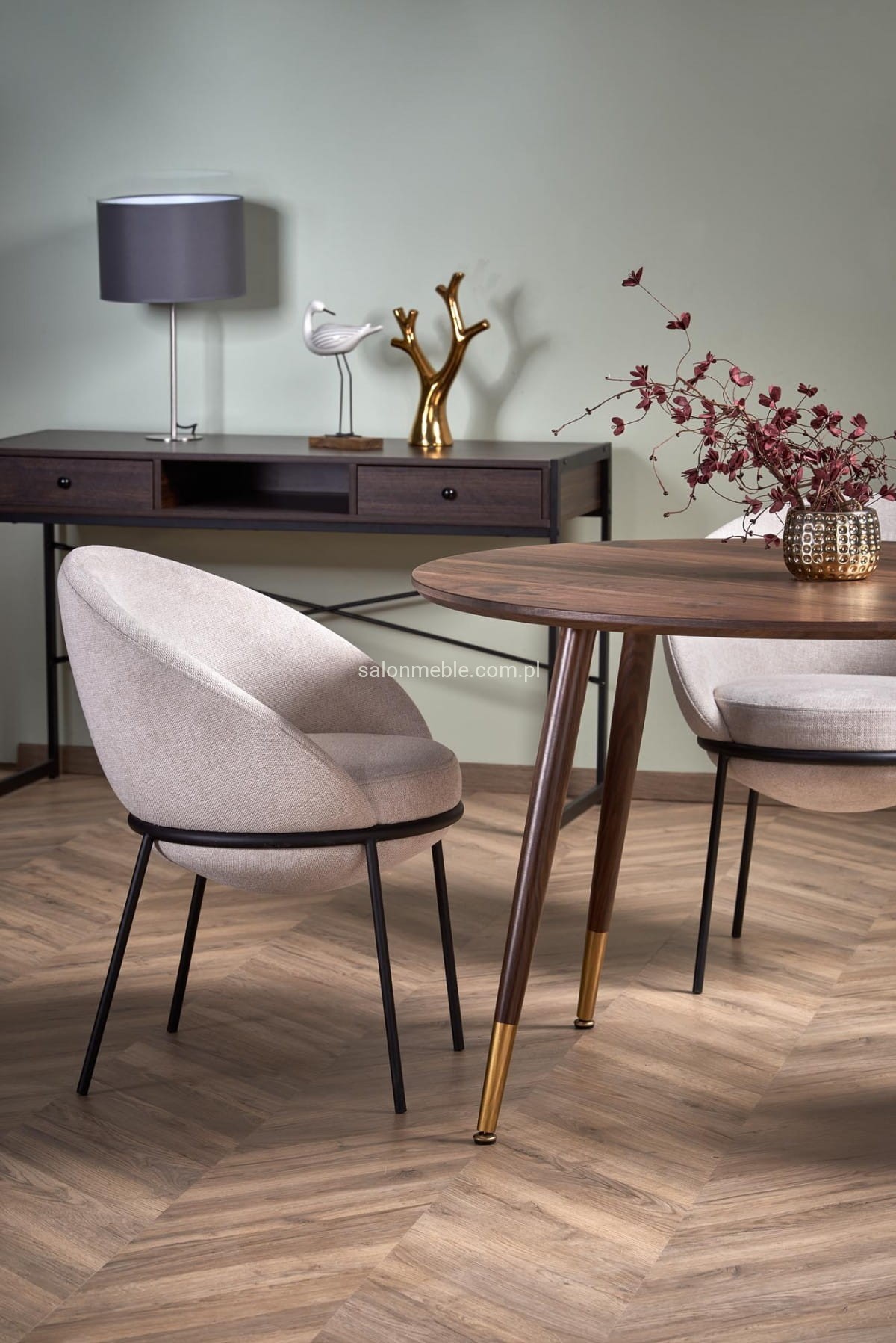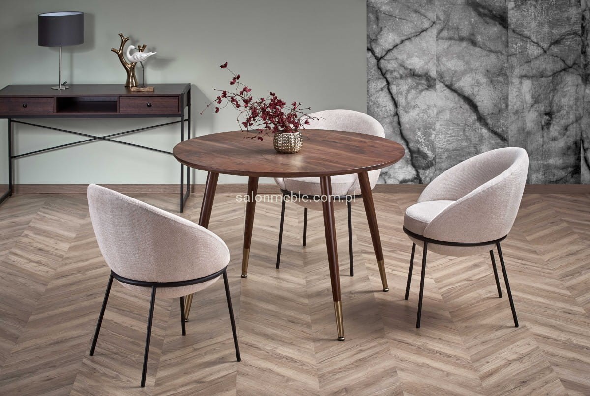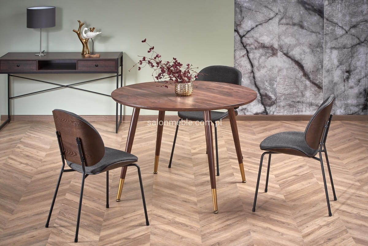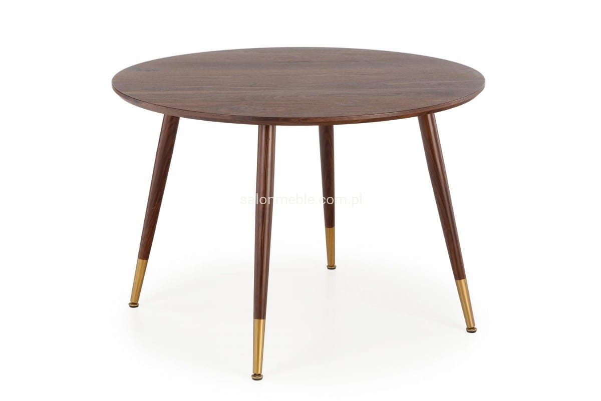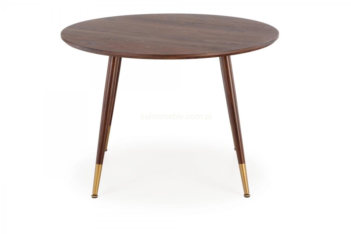wymiary: fi110/76/72 cm, materiał: MDF okleinowany / stal malowana, kolor: blat - orzech, nogi - orzech / złoty