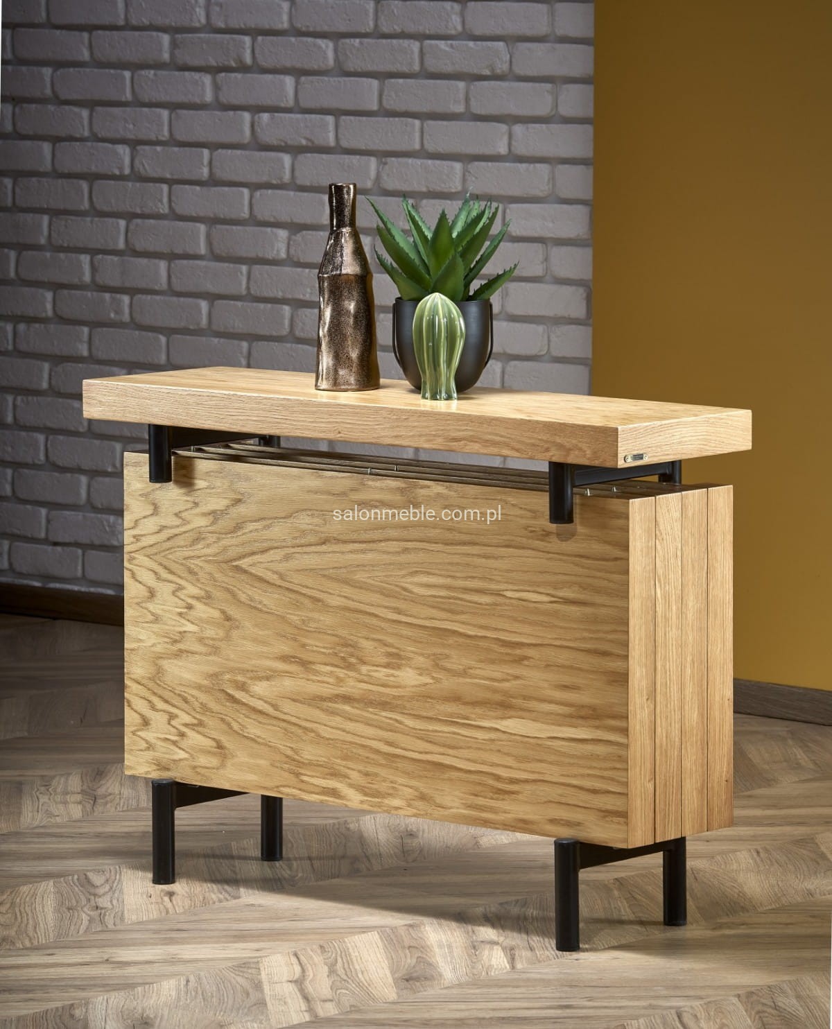 wymiary: 106x30x77 cm, materiał: MDF + okleina naturalna (dębowa) / stal malowana proszkowo, kolor: blat - dąb naturalny, nogi - czarny