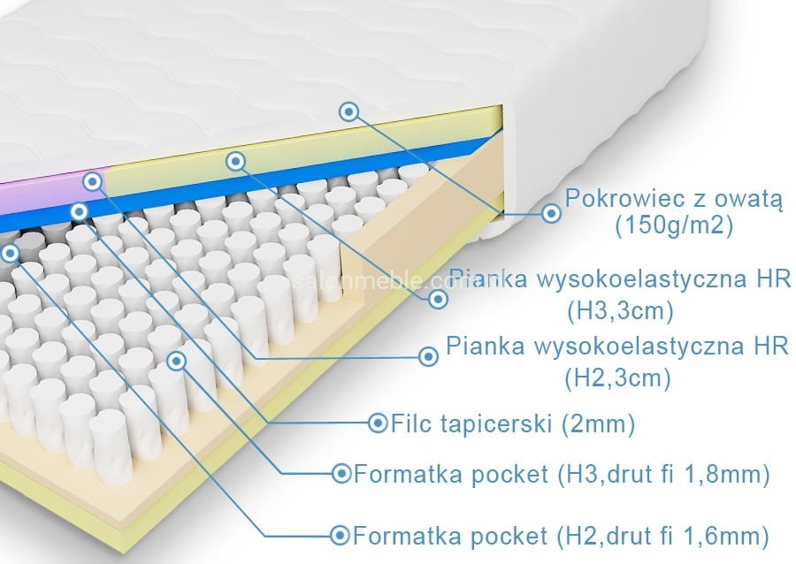 Penelopa i Odyseusz to materac pocket o dwóch twardościach - jedna połowa materaca jest średnia, a druga twarda. Dwie różne twardości zawdzięcza piance wysokoelastycznej, która została specjalnie na potrzeby materaca dopasowana tak, by nadawać mu w jednej połowie twardości mniejszej (H2), a w drugiej - większej (H3). Pianka wysokoelastyczna (HR) zapewnia materacowi elastyczność punktową, co sprawia, że kręgosłup podczas snu jest odpowiednio podparty. Zapewnia świetną wentylację i błyskawicznie reaguje na zmianę ułożenia ciała w trakcie snu. Dodatkowo materac wyposażony jest w system sprężyn typu pocket, zapewniających sprężstość powierzchniową. Sprężyny te cechują się dwoma twardościami dzięki różnej grubości drutu (twardość H2-drut 1,6mm, twardość H3-drut 1,8mm). Materac jest dwustronny - z obu stron posiada te same warstwy: 3cm pianki wysokoleastycznej-filc-sprężyny pocket-filc-3cm pianki wysokoelastycznej, więc można użytkować go bez ryzyka utraty jego właściwości.