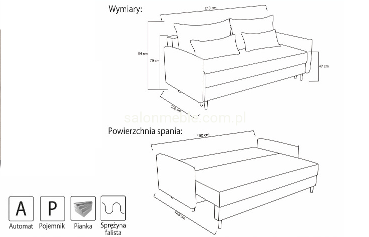 Sofa Meriva to praktyczny mebel wypoczynkowy, wykonany w stylu skandynawskim gdzie zastosowane wygodne siedzisko, powoduje iż jest to świetny meble zarówno do użytku w ciągu dnia i nocy. Wypełnienie sprężyna falista. Posiada pojemnik na pościel.
