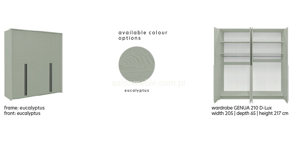 Pojemna szafa GENUA w nietuzinkowych kolorach doskonale wkomponuje się w nowoczesna sypialnię. Wnętrze szafy zapewnia dostateczną przestrzeń do przechowywania sześć pojemnych półek oraz trzy przestrzenie z drążkiem na ubrania pozwalają na zorganizowanie zarówno odzieży wiszącej, jak i składanej.