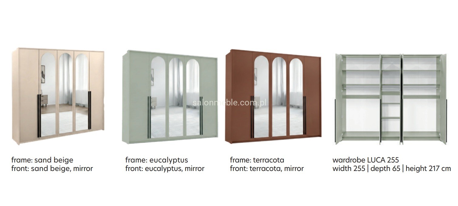 Pojemna szafa Luca w nietuzinkowych kolorach doskonale wkomponuje się w nowoczesna sypialnię. Wnętrze szafy zapewnia dostateczną przestrzeń do przechowywania sześć pojemnych półek oraz trzy przestrzenie z drążkiem na ubrania pozwalają na zorganizowanie zarówno odzieży wiszącej, jak i składanej. Dodatkowo posiada dwie szuflady wewnątrz. Mebel wykonany został z wysokiej jakości materiałów, które zagwarantują długie użytkowanie.
