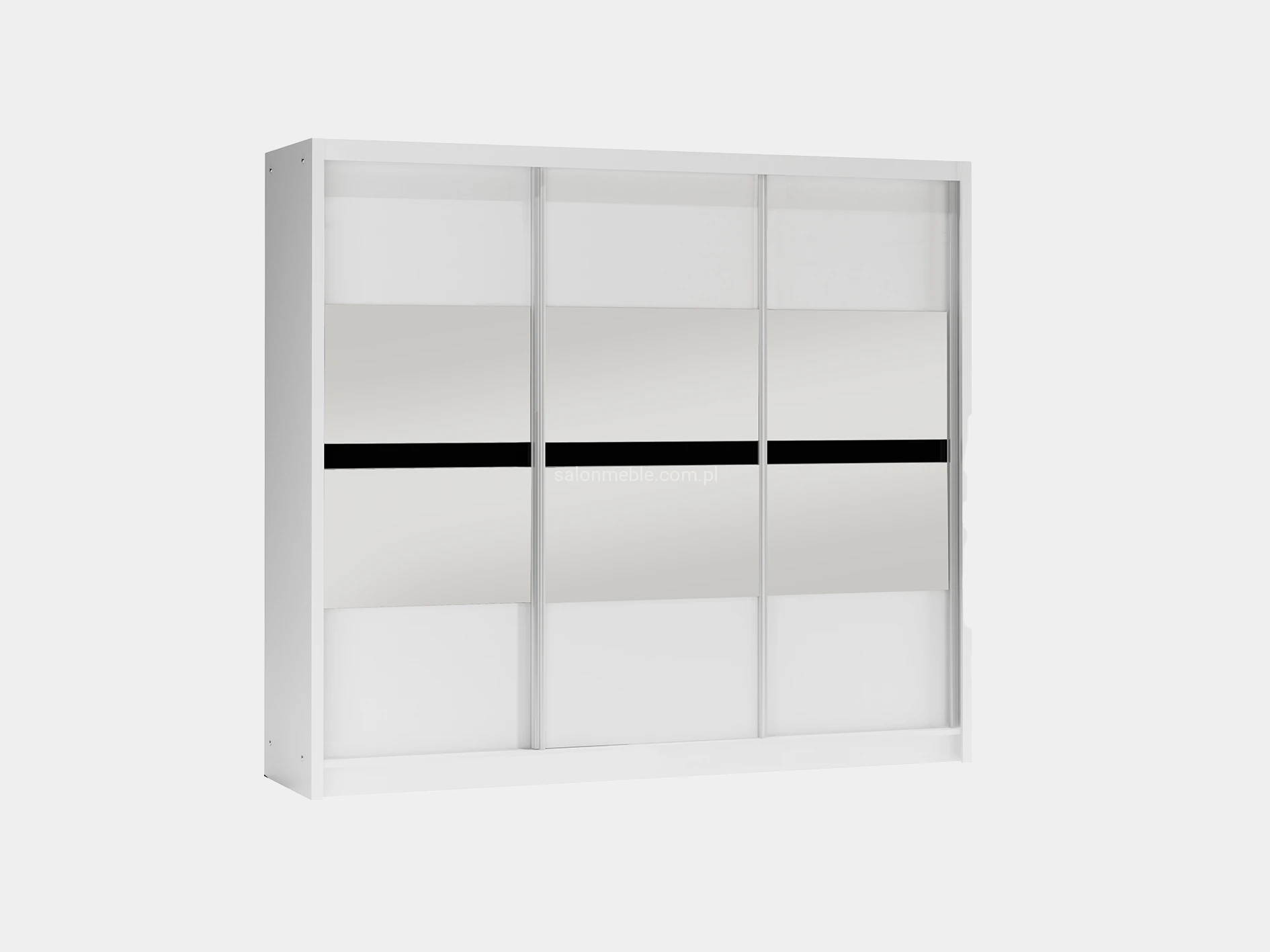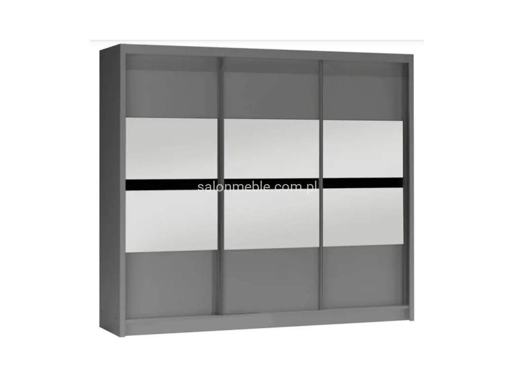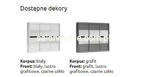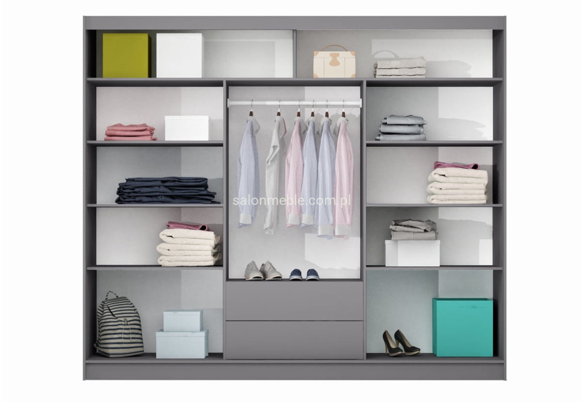 Szafa przesuwna Roomy to wysokiej jakości mebel o nowoczesnym designie , szafa posiada we wnętrzu półki oraz drążki na wieszaki. Szafa posiada trzy szuflady w dolanej części na całej szerokości . W szafach zastosowano metalowe prowadnice i łożyskowy system przesuwny firmy SEVROLL co gwarantuje łatwość przesuwania drzwi oraz wydłuża żywotność szafy.