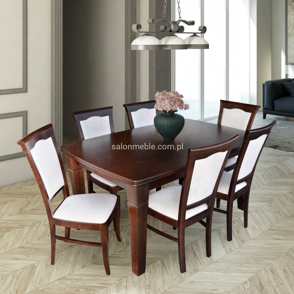 Zestaw stół rozkładany z sześcioma krzesłami można zamówić w różnych kolorach, na krzesła wybieramy tapicerkę- kolory dostępne w galerii zdjęć.